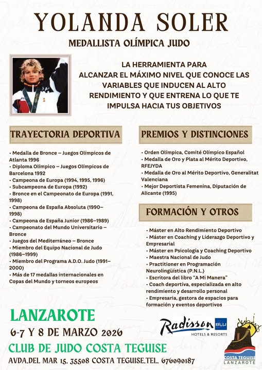 Además, como gran aperitivo del campeonato regional, el CJCT va a tener una doble visita muy especial este fin de semana. Del 6 al 8 de marzo dos grandes del Judo español, dos judokas olímpicas, madre e hija, visitarán el club teguiseño. La medallista olímpica Yolanda Soler y su hija, Ariane Toro, olímpica en Paris 2024, brindarán su conocimiento y su experiencia en torno al noble deporte del Judo a la cantera y el cuerpo técnico del club teguiseño.